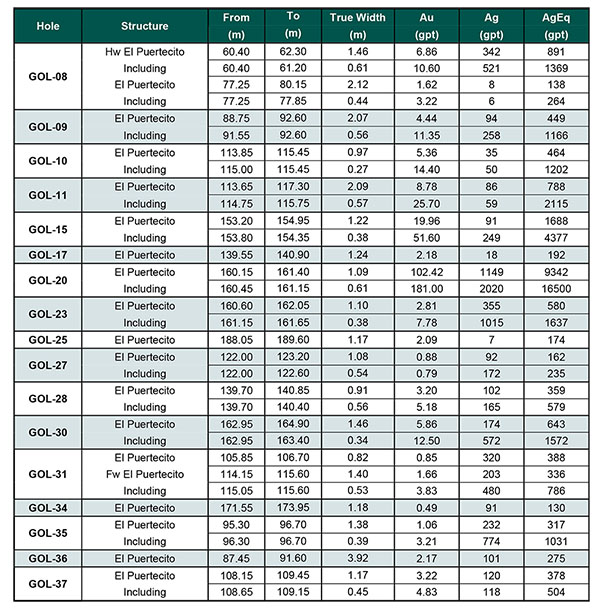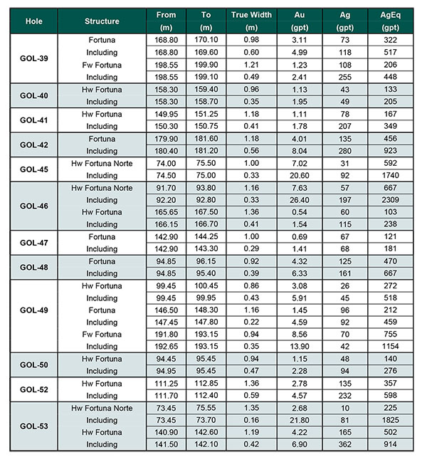 - 4.01 gpt Au and 135 gpt Ag for 456 gpt AgEq over a 1.18 m ETW , including 8.04 gpt Au and 280 gpt Ag for 923 gpt AgEq over 0.56 m in hole GOL-42