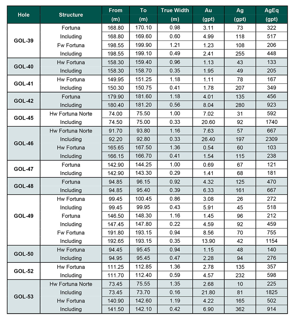 - 4.01 gpt Au and 135 gpt Ag for 456 gpt AgEq over a 1.18 m ETW , including 8.04 gpt Au and 280 gpt Ag for 923 gpt AgEq over 0.56 m in hole GOL-42