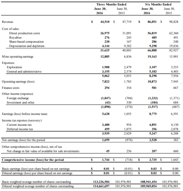 After cost of sales of $31.6 million (2015 - $40.9 million), mine operating earnings amounted to $12.9 million (2015 –$6.8 million) from mining and milling operations in Mexico. Excluding depreciation and depletion of $4.1 million (2015 - $9.3 million), and share-based compensation of $0.2 million (2015- $0.2 million), mine operating cash flow before taxes was $17.3 million (2015 – $16.4 million) in Q2, 2016. Net earnings were $1.7 million (2015 – net loss of $1.0 million) after exploration expense of $3.2 million (2015 – $2.6 million) and corporate general and administrative costs of $1.9 million (2015 – $2.5 million).
