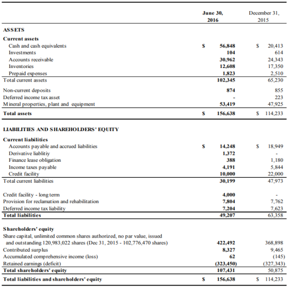 (expressed in thousands of US dollars, except for shares and per share amounts)This statement should be read in conjunction with the condensed consolidated interim financial statements for the period ended June 30, 2016 and the related notes contained therein.