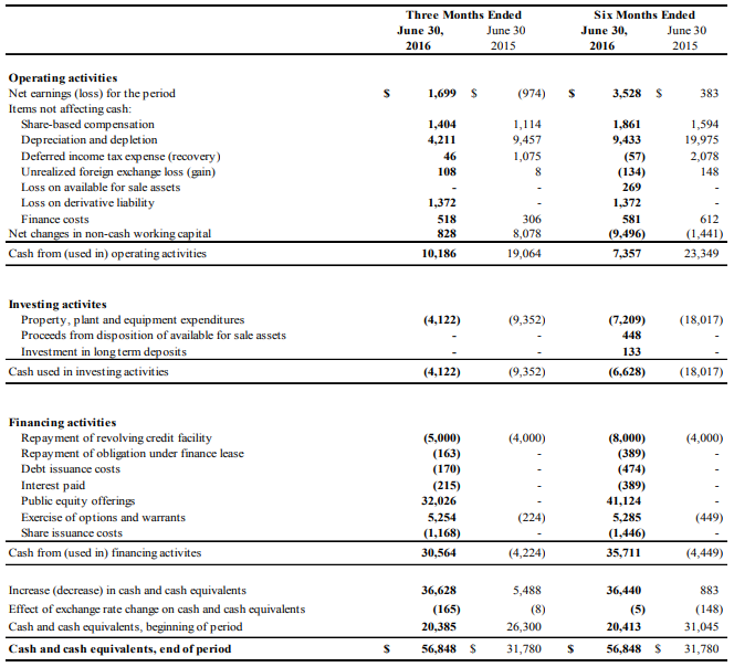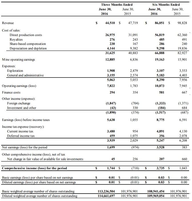 After cost of sales of $31.6 million (2015 - $40.9 million), mine operating earnings amounted to $12.9 million (2015 –$6.8 million) from mining and milling operations in Mexico. Excluding depreciation and depletion of $4.1 million (2015 - $9.3 million), and share-based compensation of $0.2 million (2015- $0.2 million), mine operating cash flow before taxes was $17.3 million (2015 – $16.4 million) in Q2, 2016. Net earnings were $1.7 million (2015 – net loss of $1.0 million) after exploration expense of $3.2 million (2015 – $2.6 million) and corporate general and administrative costs of $1.9 million (2015 – $2.5 million).