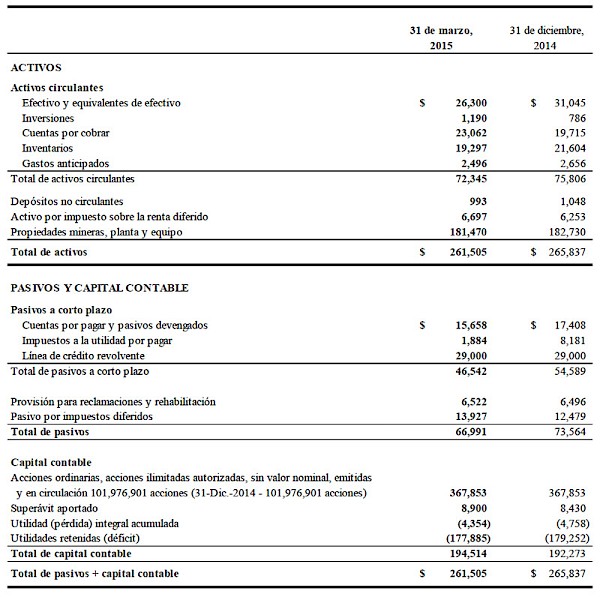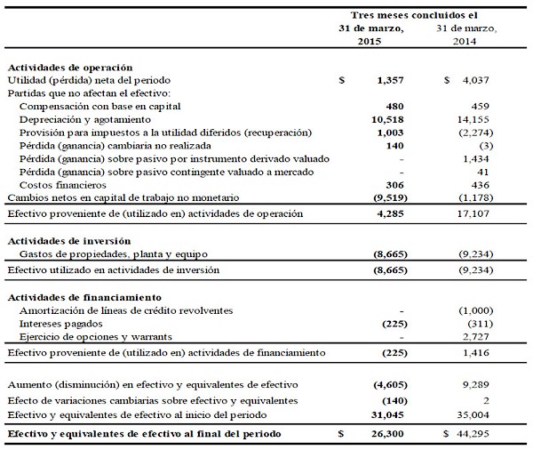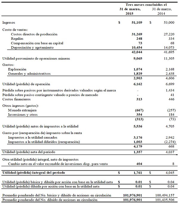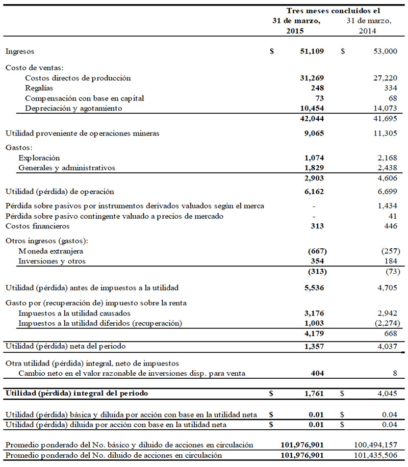 Tras el costo de ventas de $42.0 millones ($41.7 millones en 2014), las utilidades provenientes de operaciones mineras ascendieron a $9.1 millones ($11.3 millones en 2014) y tuvieron su fuente en operaciones de explotación minera y de molienda en México. Sin considerar la depreciación y agotamiento por $10.5 millones ($14.1 millones en 2014) y una compensación con base en capital por $0.1 millones (mismo monto que en 2014), los flujos de efectivo provenientes de operaciones mineras antes de impuestos fueron de $19.6 millones ($25.4 millones en 2014) en el primer trimestre de 2015. Por su parte, a utilidad neta fue de $1.4 millones ($4.0 millones en 2014).