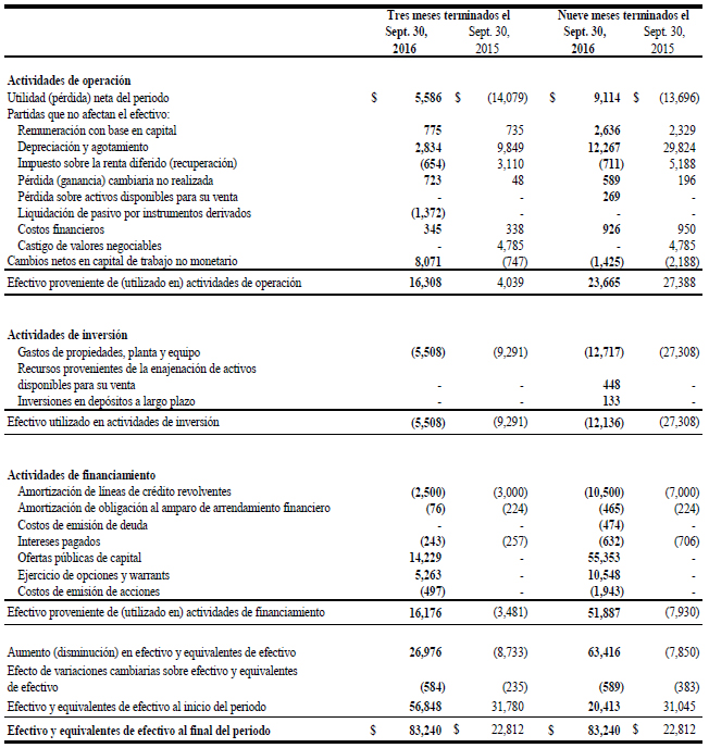 - Se recaudaron recursos netos por $13.9 millones en el tercer trimestre de 2016 mediante el segundo financiamiento vía capital a condiciones de mercado (ATM)