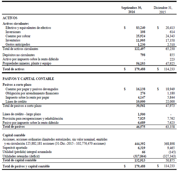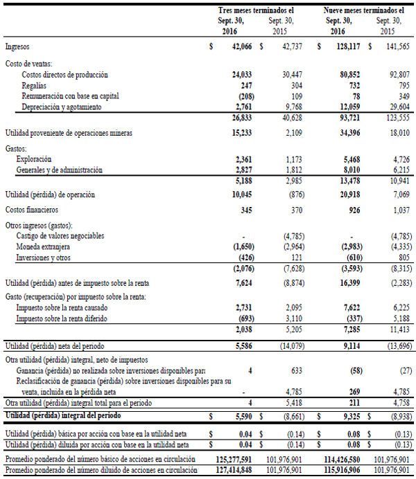Tras un costo de ventas de $26.9 millones ($40.6 millones en 2015), la utilidad proveniente de operaciones mineras totalizó $15.2 millones ($2.1 millones en 2015) y tuvo su fuente en operaciones de explotación minera y de molienda en México. Sin considerar depreciación y agotamiento por $2.8 millones ($9.8 millones en 2015) y una compensación con base en capital de $0.2 millones (un gasto de $0.1 millones en 2015), los flujos de efectivo provenientes de operaciones mineras antes de impuestos ascendieron a $17.8 millones ($12.0 millones en 2015) en el tercer trimestre de 2016. La utilidad neta ascendió a $5.6 millones (pérdida neta de $14.1 millones en 2015) tras gastos por exploración de $2.4 millones ($1.1 millones en 2015) y costos corporativos generales y de administración por $2.8 millones ($1.8 millones en 2015).