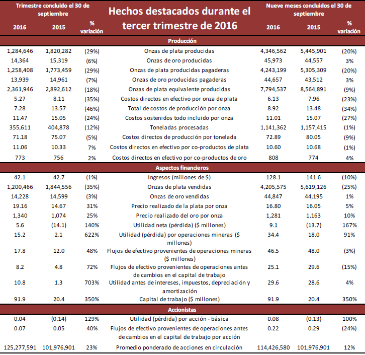 Para el tercer trimestre, concluido el 30 de septiembre de 2016, la Compañía generó ingresos totales por $42.1 millones ($42.7 millones en 2015). Durante el trimestre, la Compañía vendió 1,200,467 onzas de plata y 14,228 de oro a precios realizados de $19.16 y $1,340 por onza, respectivamente, en comparación con las ventas de 1,844,556 onzas de plata y 14,599 onzas de oro a precios realizados de $14.67 y $1,074 por onza, respectivamente, del tercer trimestre de 2015.