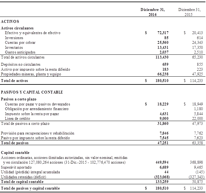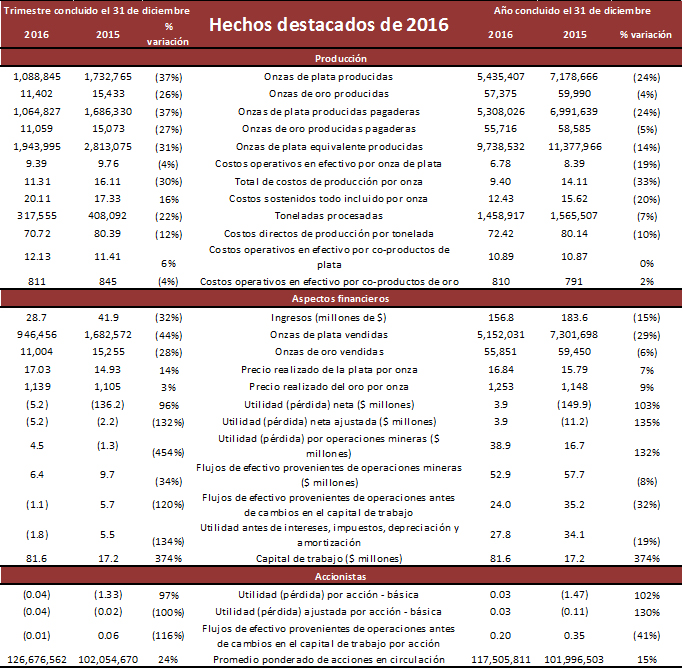 - Utilidad neta de $3.9 millones ($0.03 por acción), en comparación con una pérdida de $149.9 millones ($1.47 por acción) en 2015, que abarcó un deterioro por $134.0 millones en las minas El Cubo y Bolañitos.
