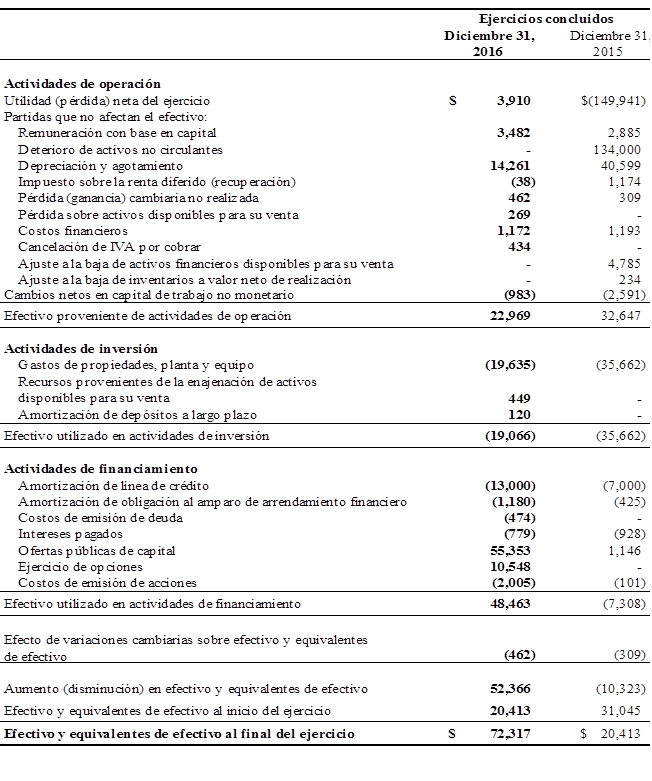 Sin considerar depreciación y agotamiento por $13.9 millones ($40.3 millones en 2015) y una remuneración con base en capital de $0.1 millones ($0.4 millones en 2015), los flujos de efectivo provenientes de operaciones mineras antes de impuestos ascendieron a $52.9 millones ($57.7 millones en 2015) en 2016. La utilidad de operación ascendió a $19.2 millones (pérdida de $131.3 millones en 2015) tras gastos por exploración de $10.4 millones ($6.3 millones en 2015) y gastos generales y de administración por $9.3 millones ($7.7 millones en 2015). En 2015, la pérdida por $131.3 millones se vio impulsada por cargos por deterioro en las minas El Cubo y Bolañitos, los cuales ascendieron a $134.0 millones.