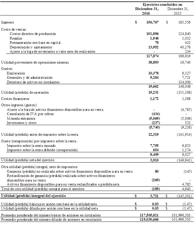 Tanto la utilidad neta como la ajustada sumaron $3.9 millones ($0.03 por acción) en comparación con una pérdida ajustada de $11.2 millones ($0.11 por acción), debido a cargos por deterioro en 2015. Los principales impulsores para el incremento en las utilidades de 2016 fueron una ligera alza en los precios de los metales preciosos, la baja significativa en los costos directos de producción y gastos por depreciación, así como la devaluación del peso mexicano, aunque dichos elementos se vieron compensados parcialmente por mayores costos de administración y de exploración.