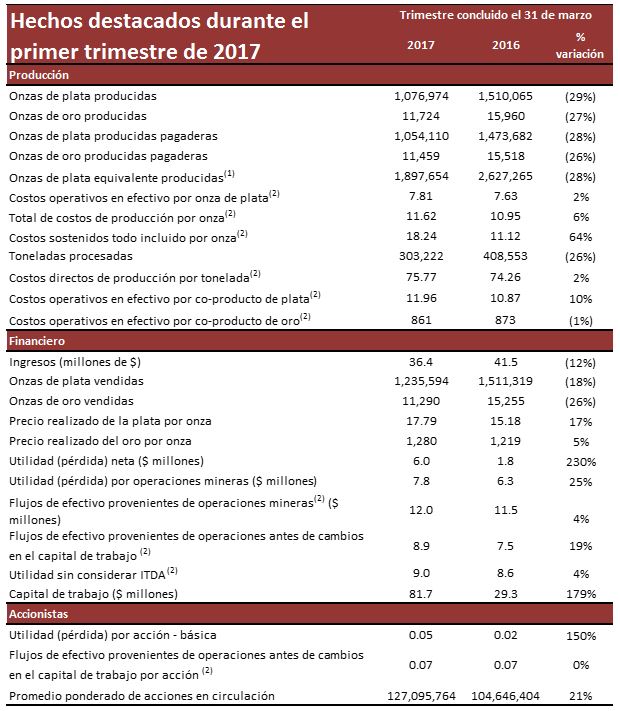 Para el primer trimestre concluido el 31 de marzo de 2017, la Compañía generó ingresos totales por $36.4 millones ($41.5 millones en 2016). Durante el trimestre, la Compañía vendió 1,235,594 onzas de plata y 11,290 de oro a precios realizados de $17.79 y $1,280 por onza, respectivamente, en comparación con las ventas de 1,511,319 onzas de plata y 15,255 de oro a precios realizados de $15.18 y $1,219 por onza, respectivamente, del primer trimestre de 2016.