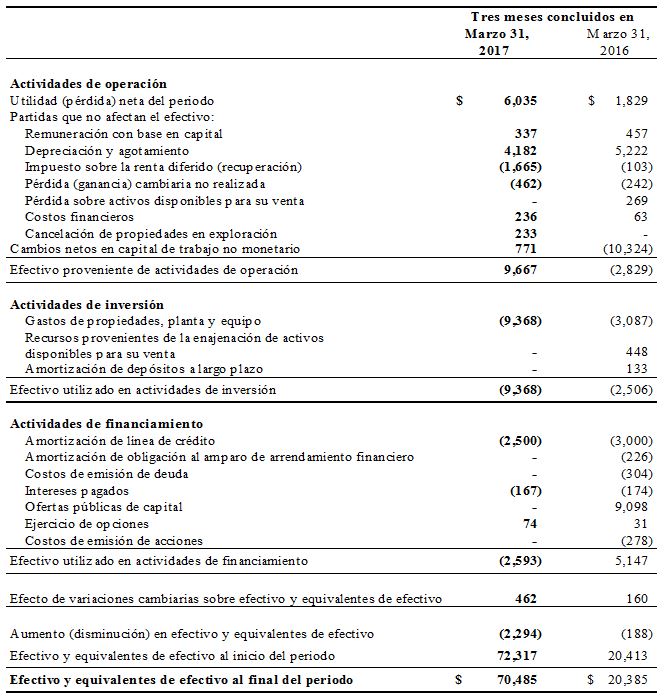 Tras un costo de ventas de $28.6 millones ($35.2 millones en 2016), la utilidad proveniente de operaciones mineras totalizó $7.8 millones ($6.3 millones en 2016) y tuvo su fuente en operaciones de explotación minera y de molienda en México. La disminución de 19% en el costo de ventas se debió principalmente a los menores niveles de producción y a la debilidad del peso mexicano contra el dólar de los Estados Unidos. Sin considerar depreciación y agotamiento por $4.1 millones ($5.2 millones en 2016), los flujos de efectivo provenientes de operaciones mineras antes de impuestos ascendieron a $12.0 millones ($11.5 millones en 2016) en el primer trimestre de 2017.