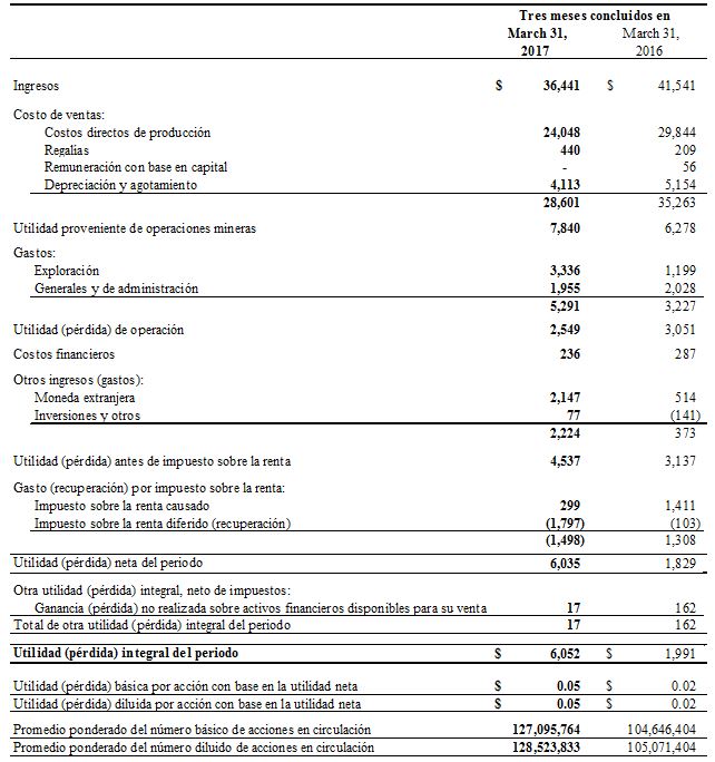 La utilidad neta fue de $6.0 millones ($1.8 millones en 2016) después de cargos por exploración, generales y de administración, resultado cambiario, otros ingresos e impuestos. Las actividades de exploración alcanzaron $3.3 millones ($1.2 millones en 2016) como resultado del renovado enfoque de la administración en labores de exploración y producción debido al aumento en los precios de los metales.