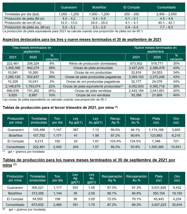 La producción consolidada de plata aumentó 39% en comparación con el tercer trimestre de 2020, impulsado principalmente por un aumento de 46% en la producción de plata en la mina Guanaceví, compensado por la suspensión de operaciones en la mina El Compás. La producción de oro aumentó 3%, con lo que la mina Guanaceví atestiguó un aumento de 47% en las onzas de plata equivalente producidas, lo que cual se vio compensado con la suspensión de operaciones en la mina El Compás. La producción de plata y oro en la mina Bolañitos aumentó moderadamente, con un alza de 11% y 8% en la producción de plata y oro, respectivamente.