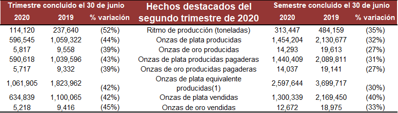Como consecuencia, el ritmo de producción de la planta disminuyó únicamente 52% y la producción de plata equivalente solo decreció 42% en comparación con el segundo trimestre de 2019. La administración espera presentar a sus accionistas una actualización sobre su pronóstico de producción y costos para el segundo semestre y el año completo cuando anuncie sus resultados financieros del segundo trimestre de 2020 el 6 de agosto de 2020.