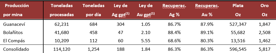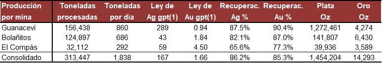 La producción consolidada del segundo trimestre de 2020, tanto de plata como de oro, fue menor a la del mismo periodo de 2019, debido a la interrupción de las actividades mineras en Guanaceví, Bolañitos y El Compás, como resultado de la pandemia de COVID-19, y la suspensión de la mina El Cubo en noviembre de 2019 como resultado de la falta de mena. Sin tomar en cuenta a El Cubo, si se le prorratea con respecto al número de días de operación, la producción del segundo trimestre de 2020 se incrementó significativamente debido a la mejora en el ritmo de producción de la planta y en las leyes minerales de Guanaceví.