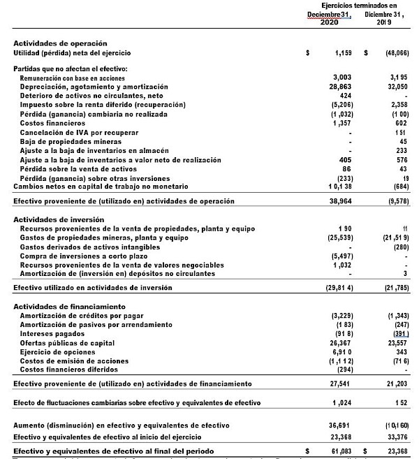 La utilidad proveniente de operaciones mineras ascendió a $27.3 millones, en comparación con una pérdida de $17.4 millones en 2019. Sin contar depreciación y agotamiento por $28.1 millones ($31.5 millones en 2019), remuneración con base en acciones de $0.3 millones ($0.2 millones en 2019) y un ajuste a la baja en inventarios por $0.4 millones ($0.6 millones en 2019), los flujos de efectivo provenientes de operaciones mineras antes de impuestos ascendieron a $56.2 millones en 2020 ($14.9 millones en 2019).