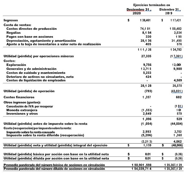 En 2020, los ingresos, netos de costos de fundición y de refinación, aumentaron 18%, hasta llegar a $138.4 millones, mientras que la considerable alza en los precios de los metales se vio compensada en forma parcial por una producción de plata equivalente 9% menor de un año a otro. Los flujos de efectivo provenientes de operaciones mineras, flujos de efectivo operativos, utilidades y EBITDA aumentaron significativamente en comparación con 2019. Las utilidades presentaron una mejoría, al ubicarse en $1.2 millones, en comparación con una pérdida neta de $48.1 millones en 2019, incluyendo utilidades por $19.9 millones del cuarto trimestre de 2020.