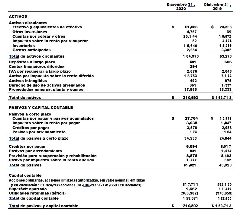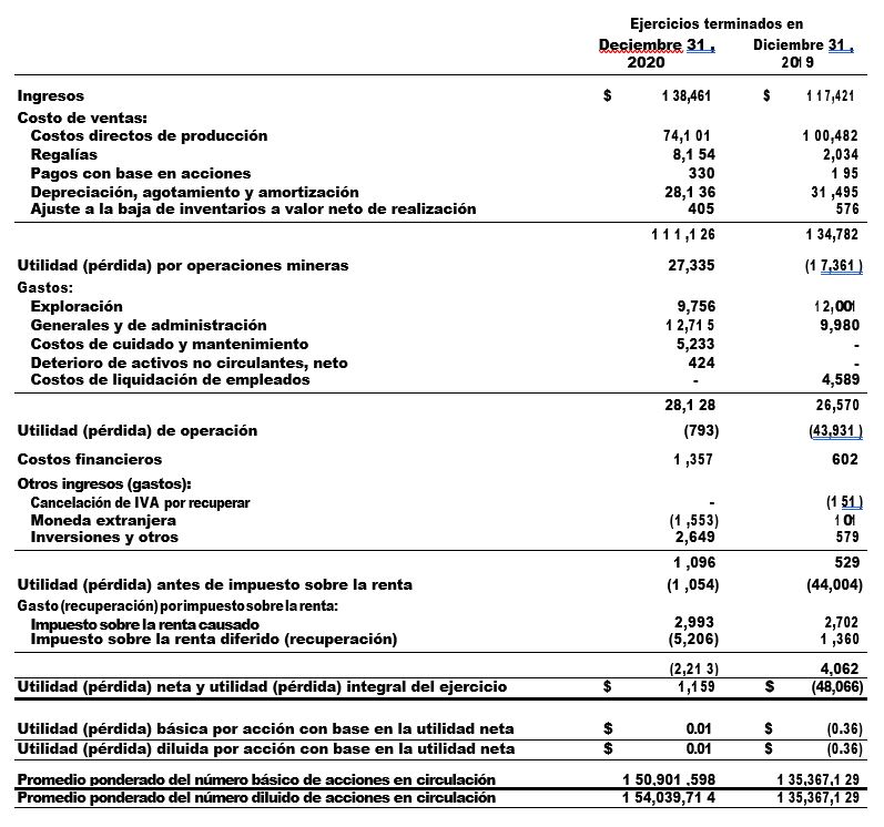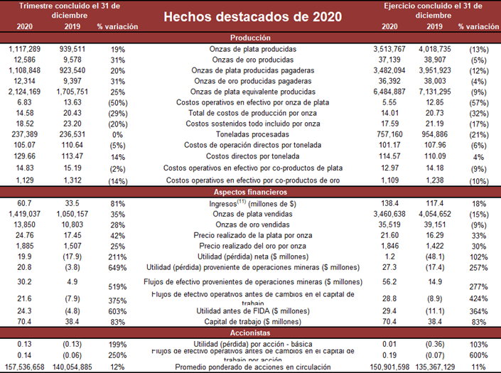 En 2020, los ingresos, netos de costos de fundición y de refinación, aumentaron 18%, hasta llegar a $138.4 millones, mientras que la considerable alza en los precios de los metales se vio compensada en forma parcial por una producción de plata equivalente 9% menor de un año a otro. Los flujos de efectivo provenientes de operaciones mineras, flujos de efectivo operativos, utilidades y EBITDA aumentaron significativamente en comparación con 2019. Las utilidades presentaron una mejoría, al ubicarse en $1.2 millones, en comparación con una pérdida neta de $48.1 millones en 2019, incluyendo utilidades por $19.9 millones del cuarto trimestre de 2020.