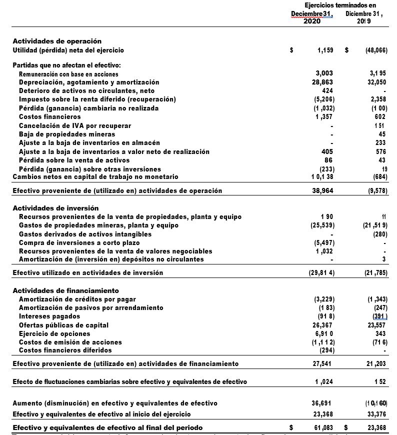 Flujos de efectivo: $28.8 millones provenientes de operaciones antes de cambios en el capital de trabajo, lo que representa un alza en comparación con la cifra negativa de $8.9 millones de 2019; los flujos de efectivo provenientes de operaciones mineras antes de impuestos(1) ascendieron a $56.2 millones, lo cual constituye un incremento en comparación con los $14.9 millones de 2019.