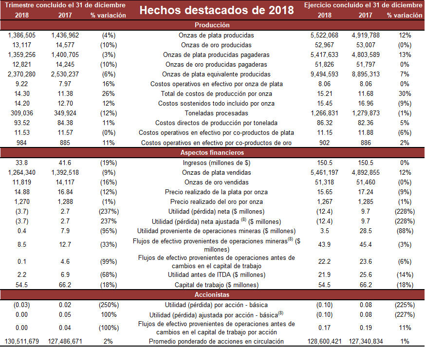 En 2018, los ingresos se mantuvieron sin cambios de un año a otro, mientras que los flujos de efectivo provenientes de operaciones mineras disminuyeron 3% como resultado de la baja en los precios de los metales, lo que se vio compensado con una mayor producción. Los costos consolidados de producción aumentaron debido a que persisten ciertos problemas en Guanaceví, parcialmente compensados por mejores costos en El Cubo. La utilidad neta disminuyó debido a una mayor depreciación y agotamiento en Guanaceví, en comparación con el ejercicio anterior. En 2018, el tonelaje de reservas probadas y probables de Guanaceví aumentó 150%, mientras que las onzas de reservas de plata equivalente hicieron lo propio en un 200%, lo cual debería dar por resultado un agotamiento significativamente menor en ese ejercicio.
