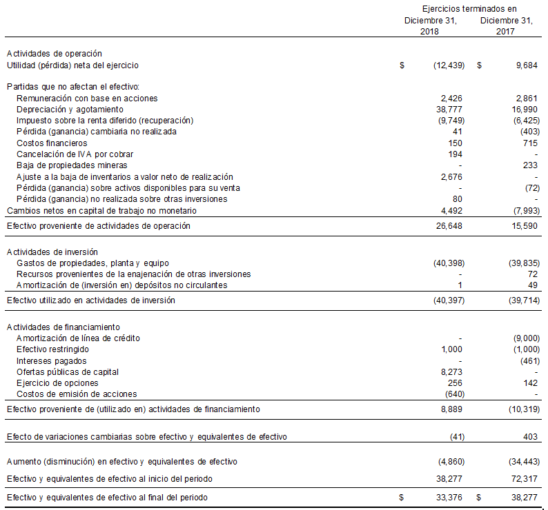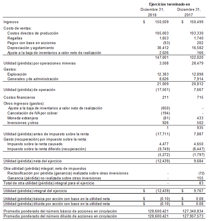Sin contar depreciación y agotamiento por $38.4 millones ($16.6 millones en 2017), recuperación de remuneración con base en acciones de $0.1 millones (gasto de $0.2 millones en 2017) y un castigo contable a inventarios por $2.0 millones ($0.1 millones en 2017), los flujos de efectivo provenientes de operaciones mineras antes de impuestos ascendieron a $43.9 millones en 2018 ($45.4 millones en 2017). La pérdida de operación ascendió a $17.5 millones (utilidad de $7.7 millones en 2017) tras gastos por exploración de $12.4 millones ($12.9 millones en 2017) y gastos generales y de administración por $8.6 millones ($7.9 millones en 2017).
