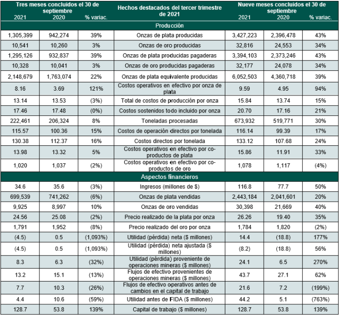 Dan Dickson, Director General Ejecutivo, comentó: “Desde la presentación de resultados del segundo trimestre, nuestros costos de operación han disminuido a niveles que se aproximan más a nuestro pronóstico para 2021. Seguimos reteniendo las ventas de metales en el tercer trimestre, lo cual ha afectado nuestro desempeño financiero y las utilidades de dicho trimestre. Al final del trimestre, contábamos con más de 1 millón de onzas de plata y 1,200 onzas de oro en lingotes. Esperamos vender este inventario en los siguientes meses, lo cual garantizará un sólido cierre de ejercicio”.