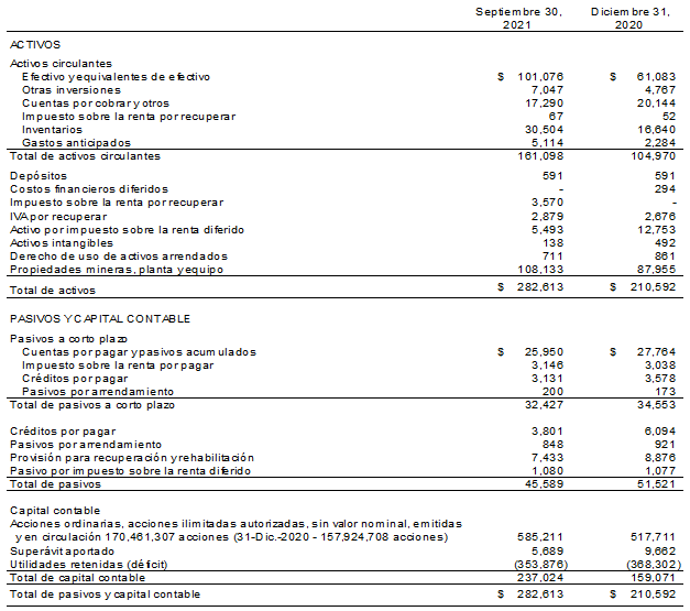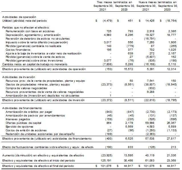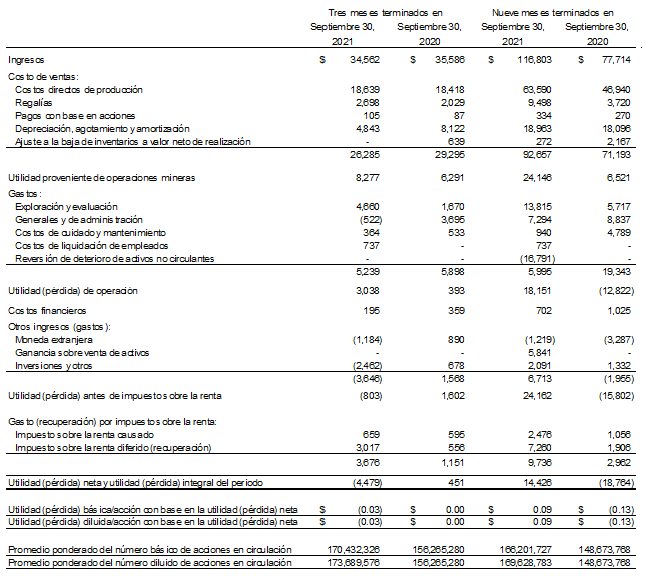 Sin contar depreciación y agotamiento por $4.8 millones ($8.1 millones el tercer trimestre de 2020) y remuneración con base en capital por $0.1 millones (mismo monto que el tercer trimestre de 2020), el flujo de efectivo proveniente de actividades mineras antes de impuestos ascendió a $13.2 millones en el tercer trimestre de 2021 ($15.1 millones en el tercer trimestre de 2020) habiendo incluido el tercer trimestre de 2020, además, un castigo contable de inventarios por $0.6 millones. La utilidad de operación ascendió a $3.0 millones ($0.4 millones en el tercer trimestre de 2020) después de gastos por exploración y evaluación por $4.7 millones ($1.7 millones en el tercer trimestre de 2020), gastos generales y de administración de $0.5 millones ($3.7 millones en el tercer trimestre de 2020), costos de liquidación de trabajadores por $0.7 millones ($0 en el tercer trimestre de 2020) y costos de cuidado y mantenimiento de $0.4 millones ($0.6 millones en el tercer trimestre de 2020). La recuperación en términos de gastos generales y de administración se debió principalmente a fluctuaciones en el valor de mercado de unidades accionarias diferidas para consejeros, con una recuperación de $2.8 millones en el tercer trimestre de 2021 versus un gasto de $1.5 millones en el mismo periodo de 2020.