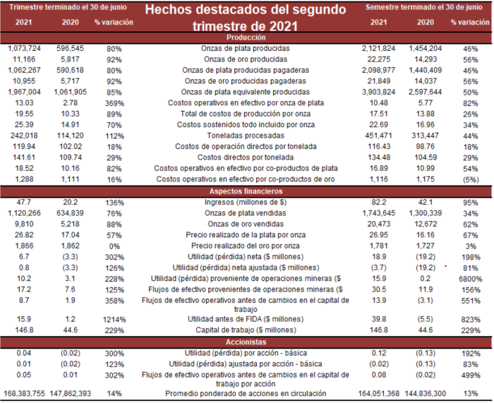- Flujos de efectivo: $8.7 millones en flujos de efectivo provenientes de operaciones antes de cambios en el capital de trabajo, lo que representó un aumento de 358% en comparación con el segundo trimestre de 2020. La Compañía siguió conservando una cantidad sustancial de producto terminado, aumentó los depósitos para compras de equipo, invirtió en actividades de exploración y avanzó el estudio de factibilidad de Terronera.