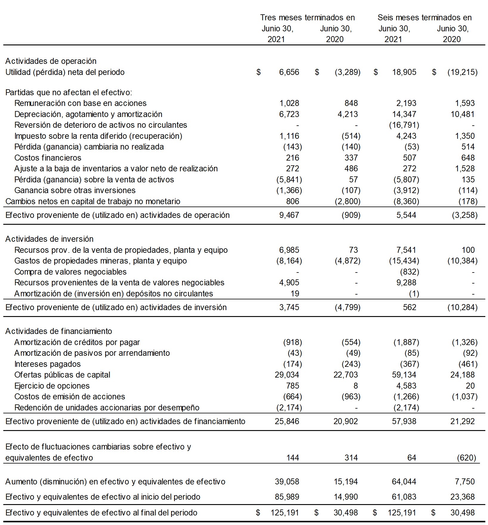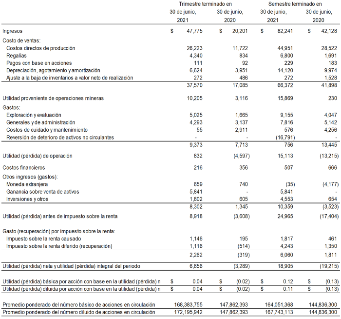 Sin contar depreciación y agotamiento por $6.6 millones ($3.9 millones en el segundo trimestre de 2020), remuneración con base en acciones de $0.1 millones (mismo monto que en el segundo trimestre de 2020) y un ajuste a la baja en inventarios por $0.3 millones ($0.5 millones en el segundo trimestre de 2020), los flujos de efectivo provenientes de operaciones mineras antes de impuestos ascendieron a $17.2 millones en el segundo trimestre de 2021 ($7.6 millones en el segundo trimestre de 2020). La utilidad de operación ascendió a $0.8 millones (pérdida de $4.6 millones en el segundo trimestre de 2020) después de gastos por exploración y evaluación por $5.0 millones ($1.7 millones en el segundo trimestre de 2020), gastos generales y de administración de $4.3 millones ($3.1 millones en el segundo trimestre de 2020) y costos de cuidado y mantenimiento de $0.1 millones ($2.9 millones en el segundo trimestre de 2020).
