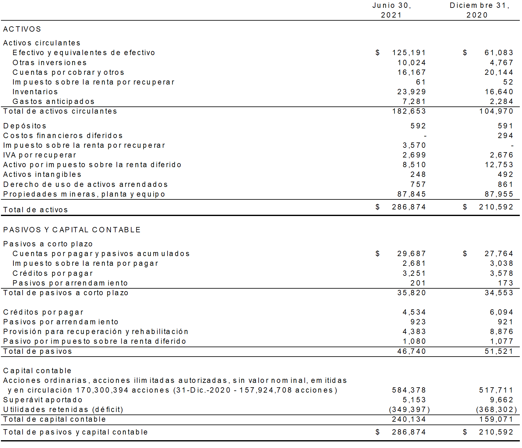 - Utilidades: Utilidades realizadas de $6.7 millones o $0.04 por acción, que representan un aumento notable en comparación con la pérdida de $3.3 millones en el segundo trimestre de 2020, debido a un aumento en la utilidad proveniente de operaciones mineras, la ganancia sobre la venta del activo El Cubo y una ganancia sobre la venta de títulos negociables, compensado por mayores actividades de exploración y evaluación, un aumento en los costos generales y de administración, así como un alza en el gasto fiscal. Sin incluir la ganancia sobre la venta del activo El Cubo, la utilidad ajustada ascendió a $0.8 millones. Al cierre del trimestre, se registró el inventario de productos terminados a un costo de $10.1 millones, en comparación con el valor razonable de mercado de $17.3 millones.