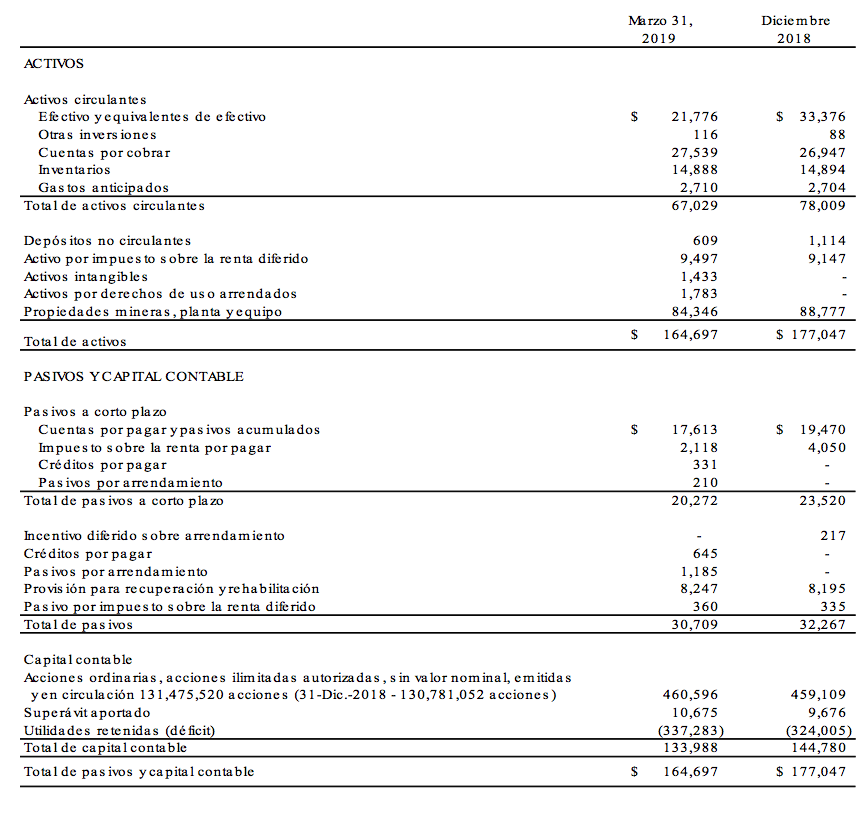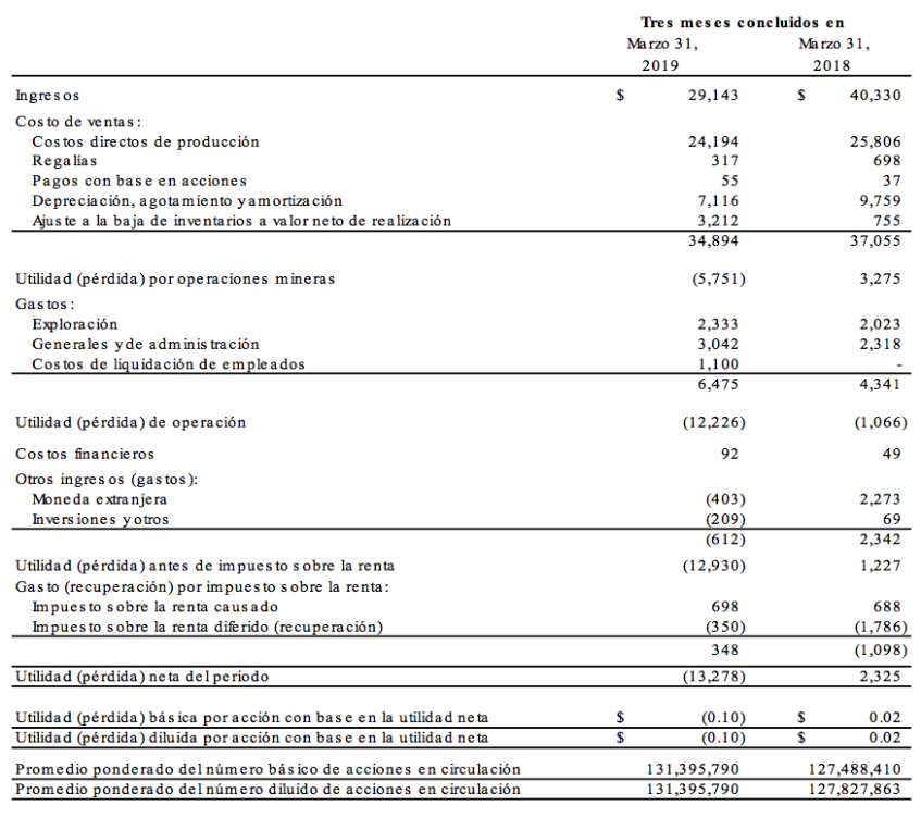 Tras un costo de ventas de $34.9 millones ($37.1 millones en el primer trimestre de 2018), la pérdida proveniente de operaciones mineras totalizó $5.8 millones (utilidad de $3.3 millones en el primer trimestre de 2018) y tuvo su fuente en operaciones de explotación minera y de molienda en México. La disminución de 6% en el costo de ventas se debió principalmente a una reducción en el renglón de depreciación, agotamiento y amortización y un ajuste a la baja $3.2 millones en la producción de inventarios a valor neto de realización. Sin tomar en cuenta depreciación y agotamiento por $7.1 millones ($9.8 millones en el primer trimestre de 2018), pagos de remuneración con base en acciones por $55,000 ($37,000 en el primer trimestre de 2018) y castigo de inventarios por $3.2 millones ($0.8 millones en el primer trimestre de 2018), los flujos de efectivo provenientes de operaciones mineras antes de impuestos ascendieron en el primer trimestre de 2019 a $4.6 millones ($13.8 millones en el primer trimestre de 2018).