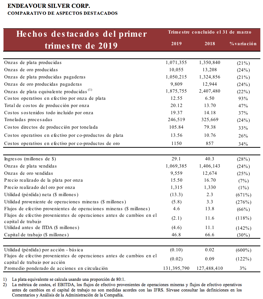 Vancouver, Canadá – 6 de mayo de 2019 - Endeavour Silver Corp. (clave de pizarra EXK (NYSE) y EDR (TSX)) anunció hoy sus resultados financieros correspondientes al periodo terminado el 31 de marzo de 2019. La Compañía posee y opera cuatro minas subterráneas de plata-oro en México: la mina Guanaceví, en el estado de Durango, las minas Bolañitos y El Cubo, en el estado de Guanajuato, y la mina El Compás, recientemente puesta en marcha en el estado de Zacatecas. De igual forma, Endeavour está avanzando con el proyecto Terronera, en el estado de Jalisco, para la toma de una decisión de desarrollo y llevando a cabo una evaluación económica preliminar a fin de adelantar con el proyecto Parral, en el estado de Chihuahua.
