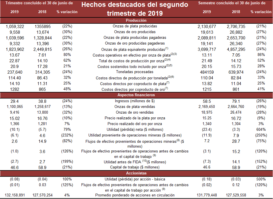 La Compañía informa una pérdida neta de $10.1 millones en el segundo trimestre de 2019, en comparación con una pérdida de $5.7 millones en el mismo periodo del año anterior, debido principalmente a menores ingresos y mayores costos unitarios de producción. Los ingresos disminuyeron 24% debido a una menor producción y una baja en los precios realizados de la plata, compensados parcialmente por un alza en los precios realizados del oro. Los flujos de efectivo provenientes de operaciones mineras antes de impuestos(1) disminuyeron 82%, con lo que se ubicaron en $2.6 millones debido a una menor producción, aunque los flujos de efectivo provenientes de operaciones antes de cambios en el capital de trabajo experimentaron una baja, hasta alcanzar una pérdida de $1.0 millón. Los costos operativos en efectivo aumentaron 80%, con lo que se ubicaron en $13.67 por onza de plata pagadera (neto de créditos por oro), en tanto que los costos sostenidos todo incluido se incrementaron 21%, hasta colocarse en $20.90 por onza de plata pagadera (neto de créditos por oro).