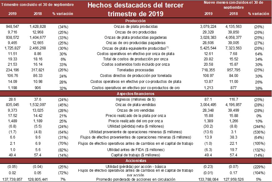 La Compañía reportó una pérdida neta de $6.8 millones en el tercer trimestre de 2019, en comparación con una pérdida de $5.5 millones en el mismo periodo del año anterior, debido principalmente a menores ingresos, lo que se compensó parcialmente con menores costos de venta. Los ingresos disminuyeron 24% debido a una menor producción, lo que se compensó parcialmente con un alza en los precios realizados de los metales. Los flujos de efectivo provenientes de operaciones mineras antes de impuestos(1) disminuyeron 31%, con lo que se ubicaron en $6.6 millones debido a una menor producción, aunque los flujos de efectivo operativos antes de cambios en el capital de trabajo experimentaron una baja, hasta alcanzar $2.1 millones. Los costos operativos en efectivo aumentaron 30%, con lo que se ubicaron en $11.51 por onza de plata pagadera (neto de créditos por oro), en tanto que los costos sostenidos todo incluido se incrementaron 33%, hasta colocarse en $21.53 por onza de plata pagadera (neto de créditos por oro).