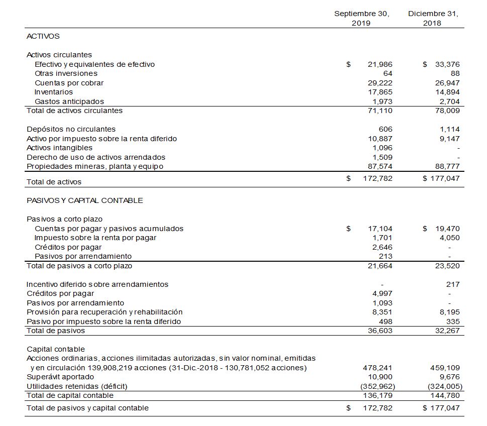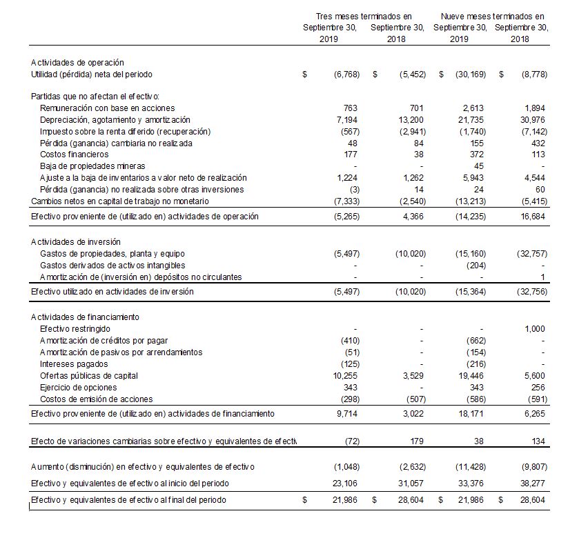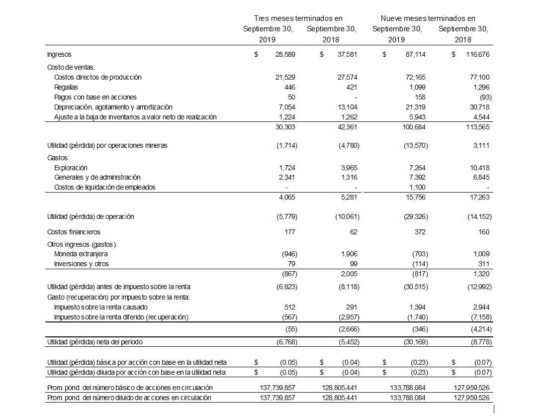 Tras un costo de ventas de $30.3 millones ($42.4 millones en 2018), la pérdida proveniente de operaciones mineras totalizó $1.7 millones ($4.8 millones en 2018) y tuvo su fuente en operaciones de explotación minera y de molienda en México. La disminución de 28% en el costo de ventas se debió principalmente a una menor producción. Sin tomar en cuenta depreciación y agotamiento por $7.1 millones ($31.1 millones en 2018), gasto por pagos con base en acciones por $0.1 millones ($0 en 2018) y castigo de inventarios por $1.2 millones ($1.3 millones en 2018), los flujos de efectivo provenientes de operaciones mineras antes de impuestos ascendieron a $6.6 millones ($9.6 millones en 2018) en el tercer trimestre de 2019. Las pérdidas netas ascendieron a $6.8 millones ($5.5 millones en 2018) después de gastos de exploración, generales y de administración, así como resultado cambiario.